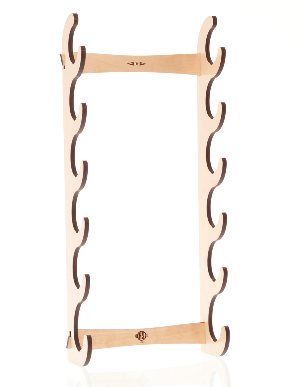 This wall-mounted flute rack can display up to six flutes. It is designed to easily be hung on a wall and includes mounting hardware.