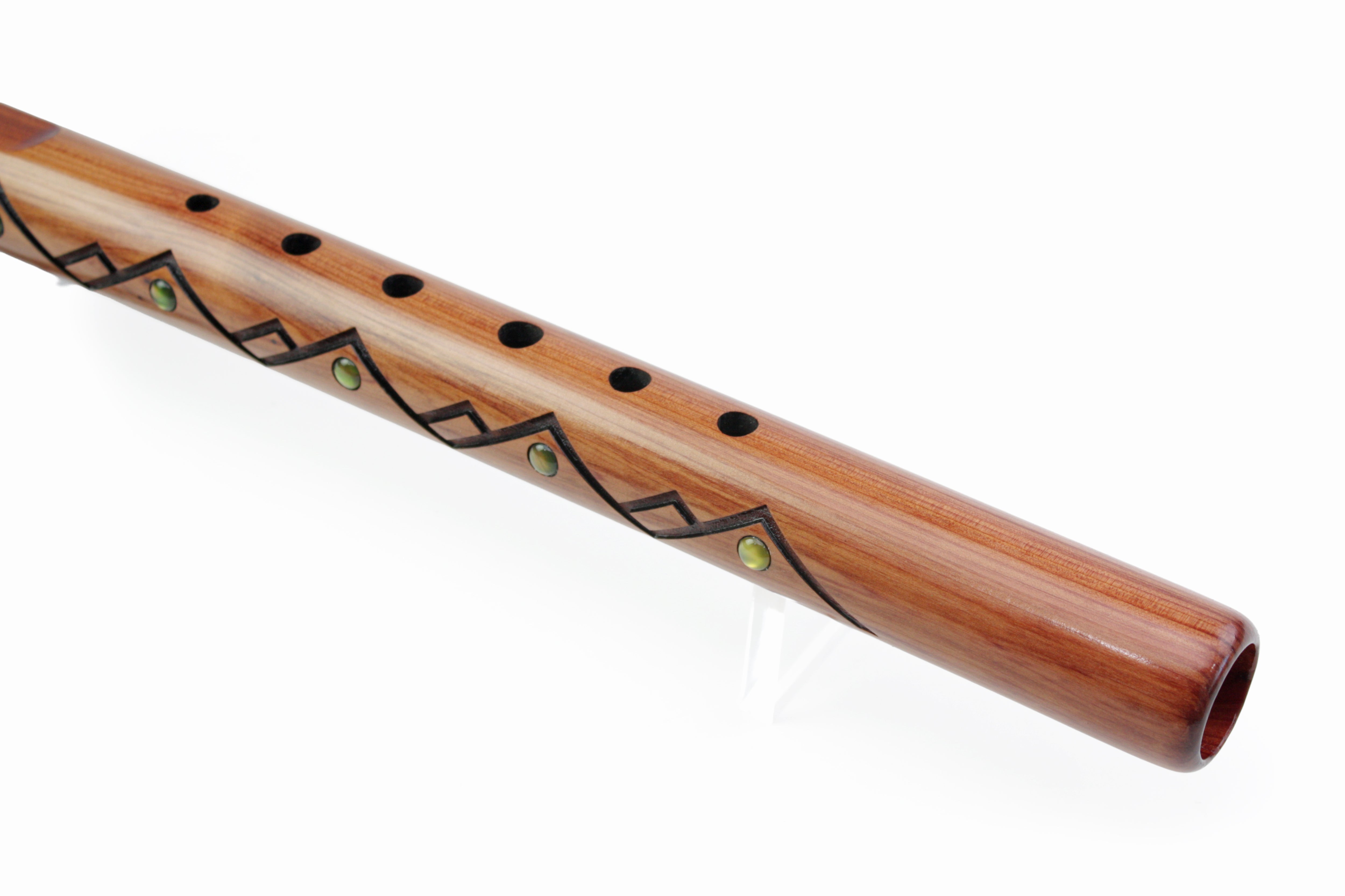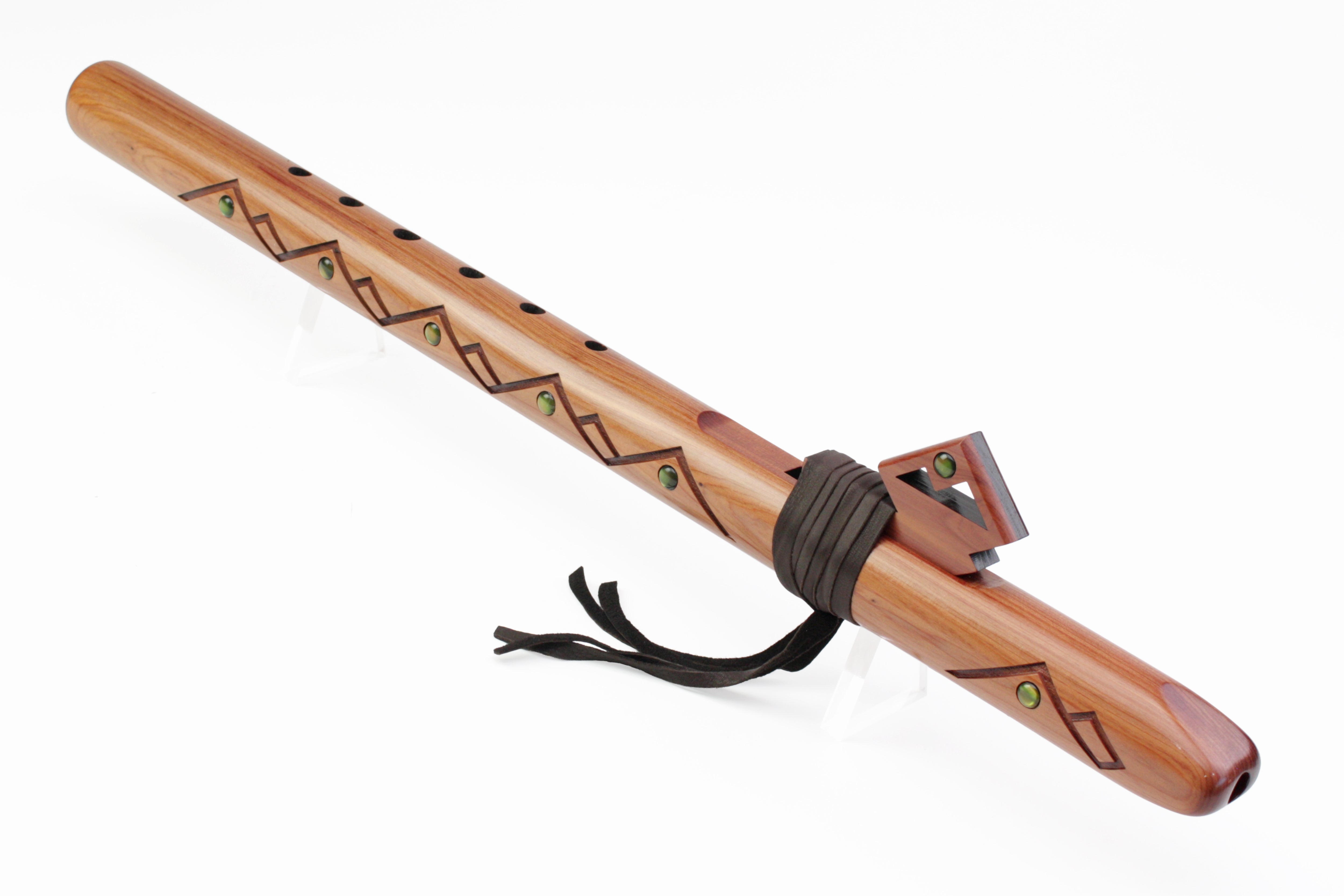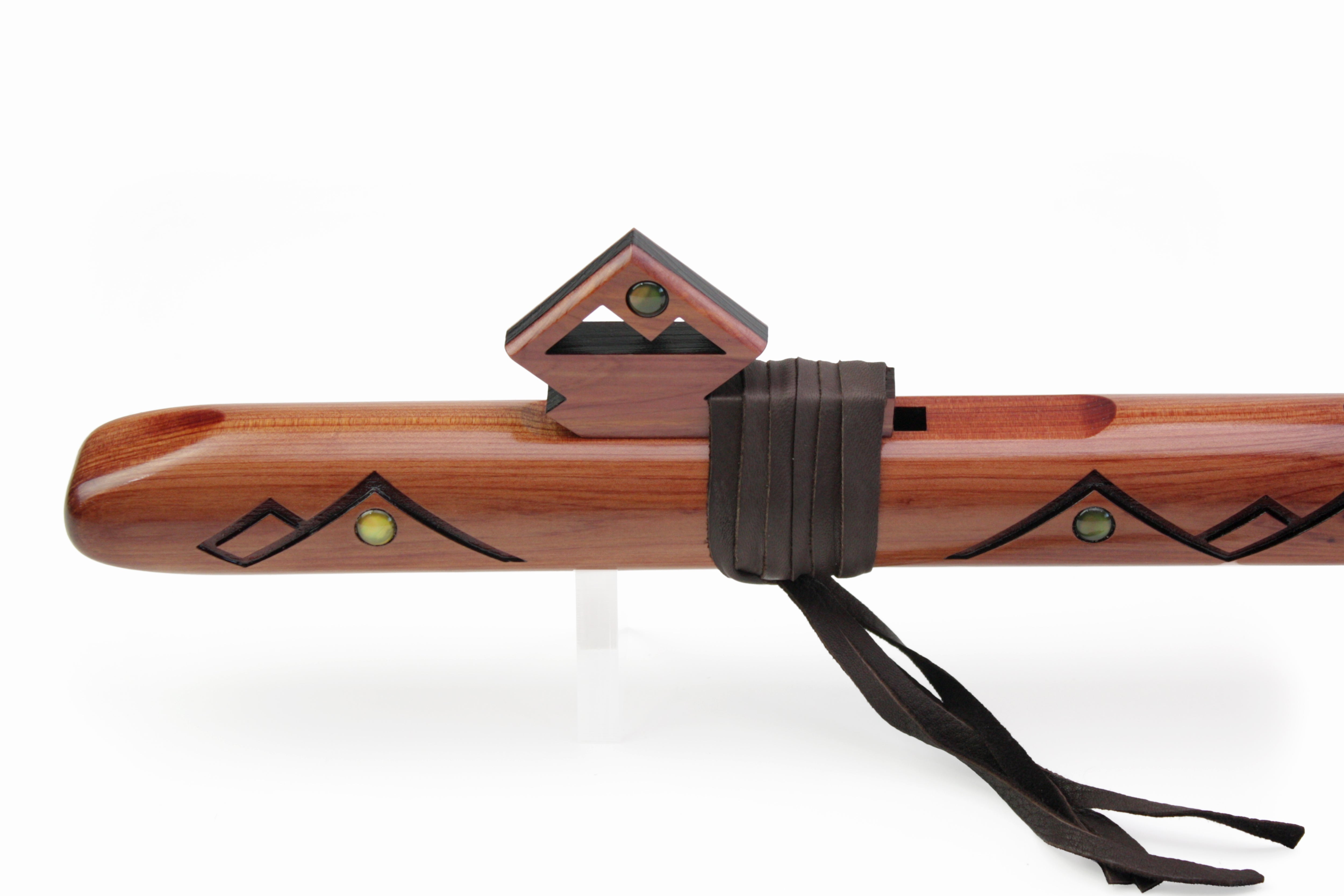 Our Signature Series Mountain Flute in the key of 'G' minor (440 Hz) is handcrafted from a single, solid piece of Aromatic Cedar wood with decorative Black Lip Shell inlaid cabochons. Aromatic Cedar is known as an exception tonal wood for musical instruments because of its ability to offer warm, and balanced sound quality.
