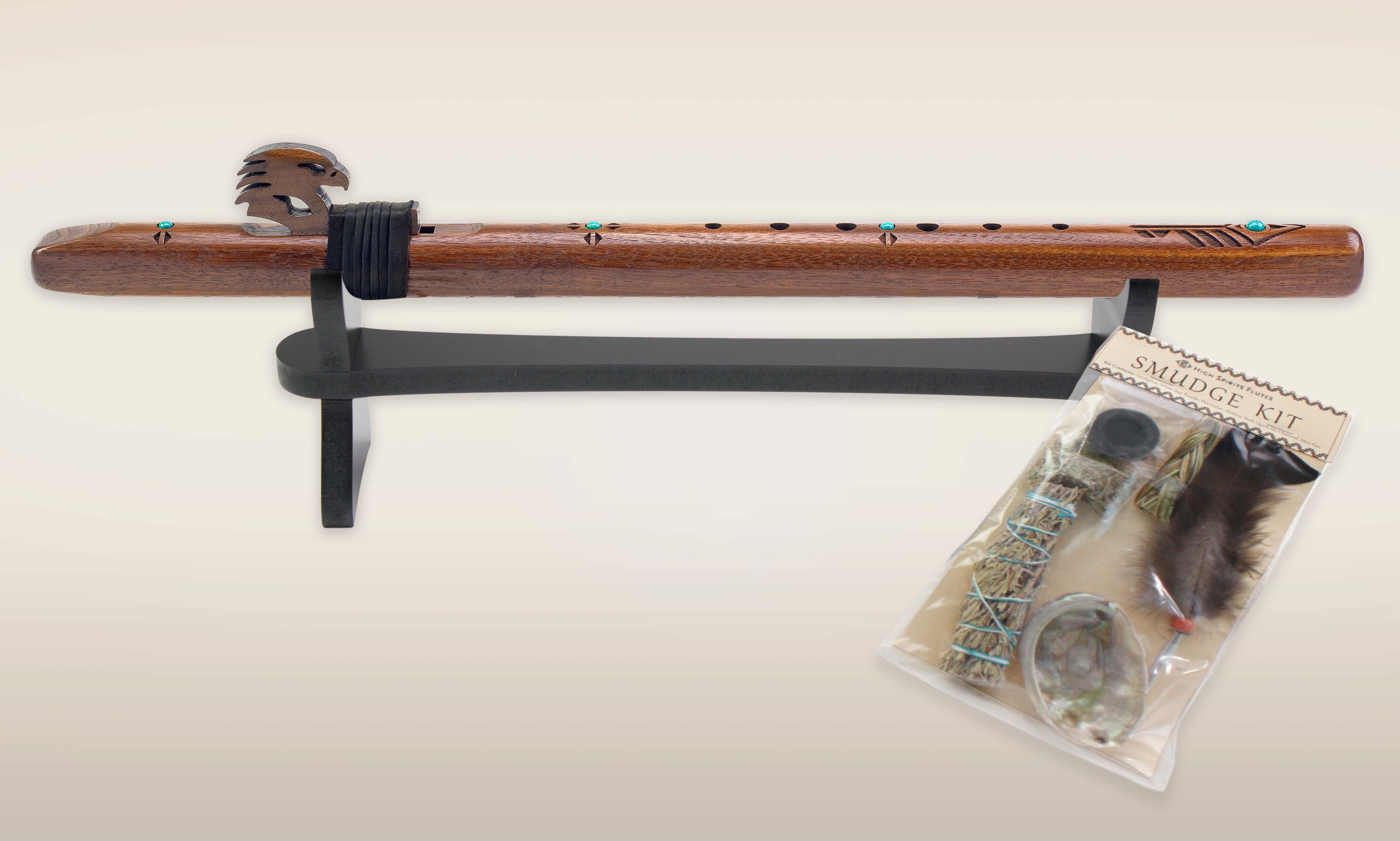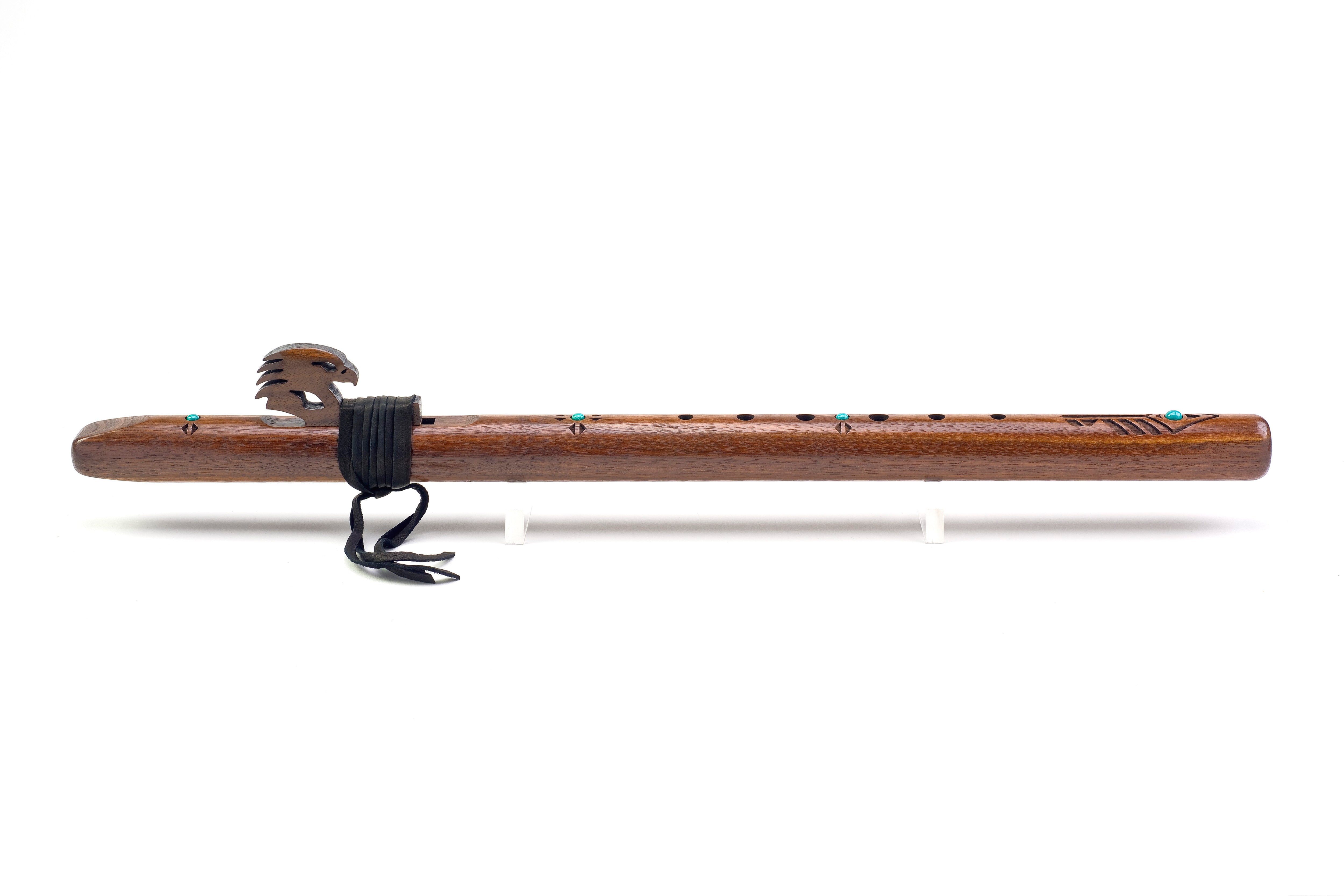 Golden Eagle "F♯": Made from domestic Walnut, a hardwood, which makes it ideal for outdoor use such as hiking and backpacking. It is inlaid with Turquoise cabochons adding to the natural beauty of the flute, and enhancing its quality as functional art.