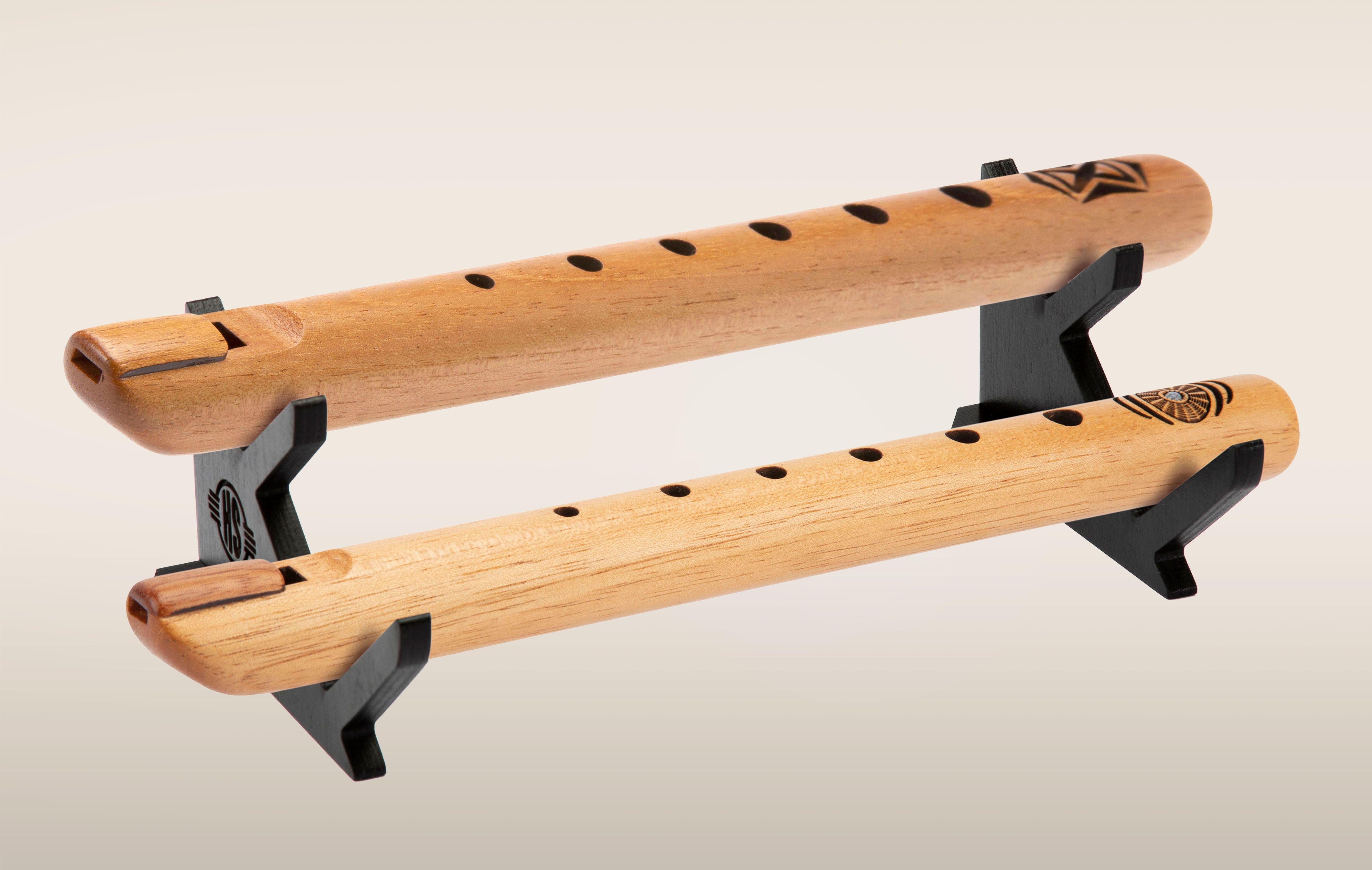 Our Spirit Frequency Package includes a two high 'D' minor Spirit Flutes and a Double Flute Stand to display them.