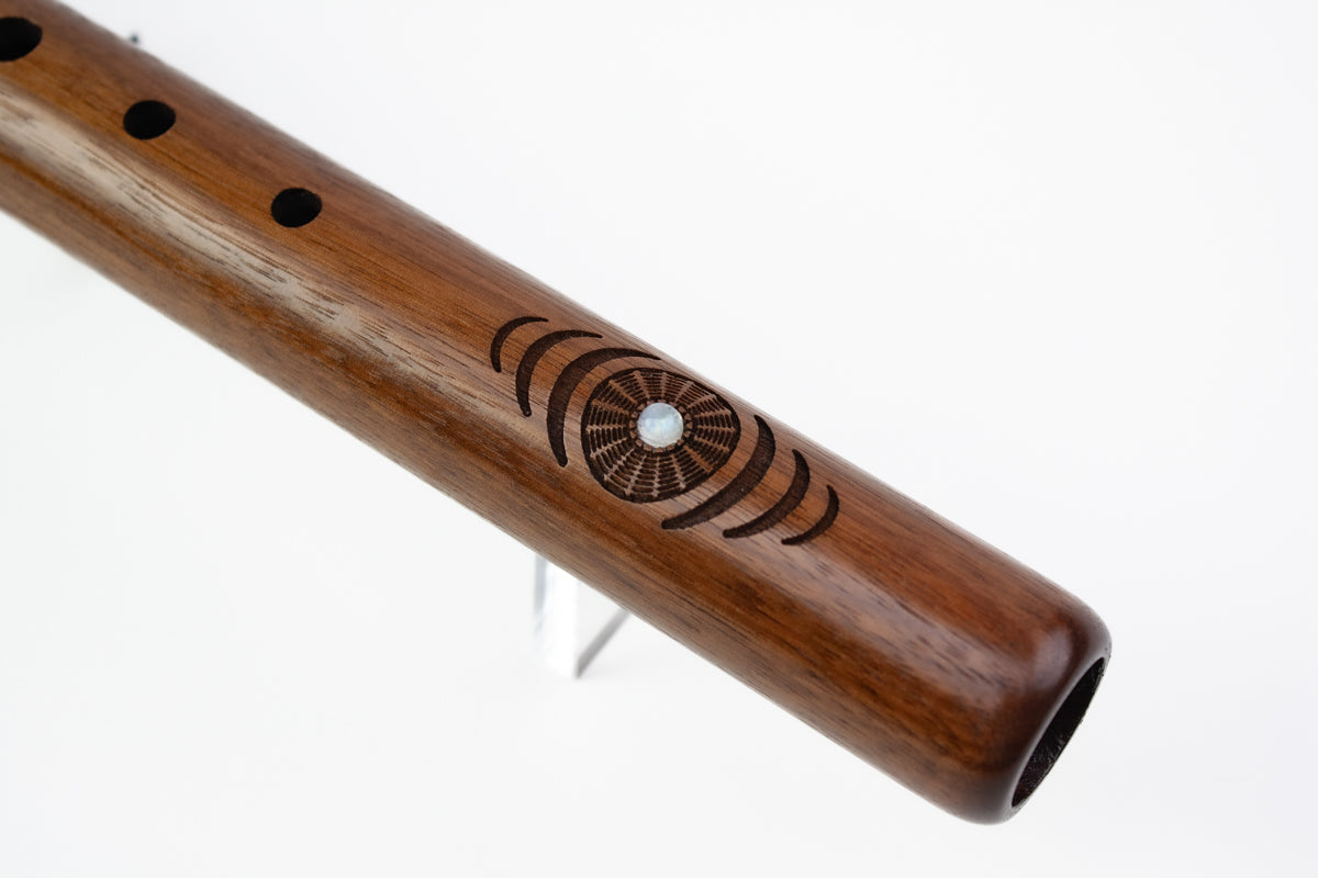 Cette flûte en bois comporte des cabochons incrustés de Rainbow Moonstone, un fétiche symbolisant le cercle de la vie, et elle est gravée d'un motif géométrique représentant la fréquence 432Hz.