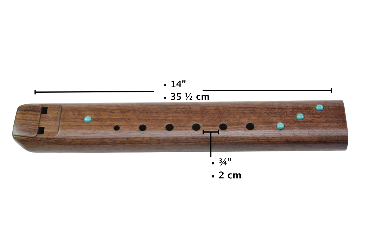 As dimensões desta flauta são: 14 polegadas de comprimento (35,6 cm) por 2,25 polegadas de largura (5,7 cm) por 1,25 polegadas de profundidade (3,2 cm)