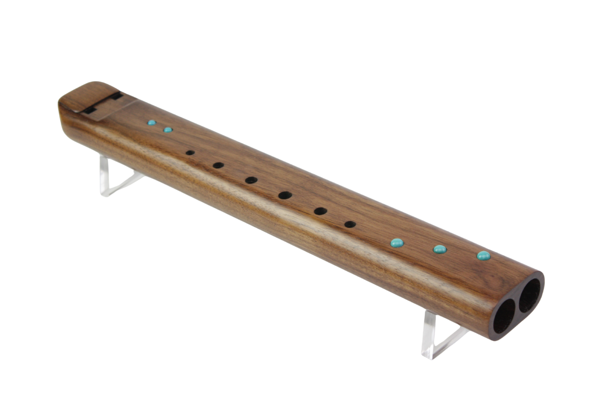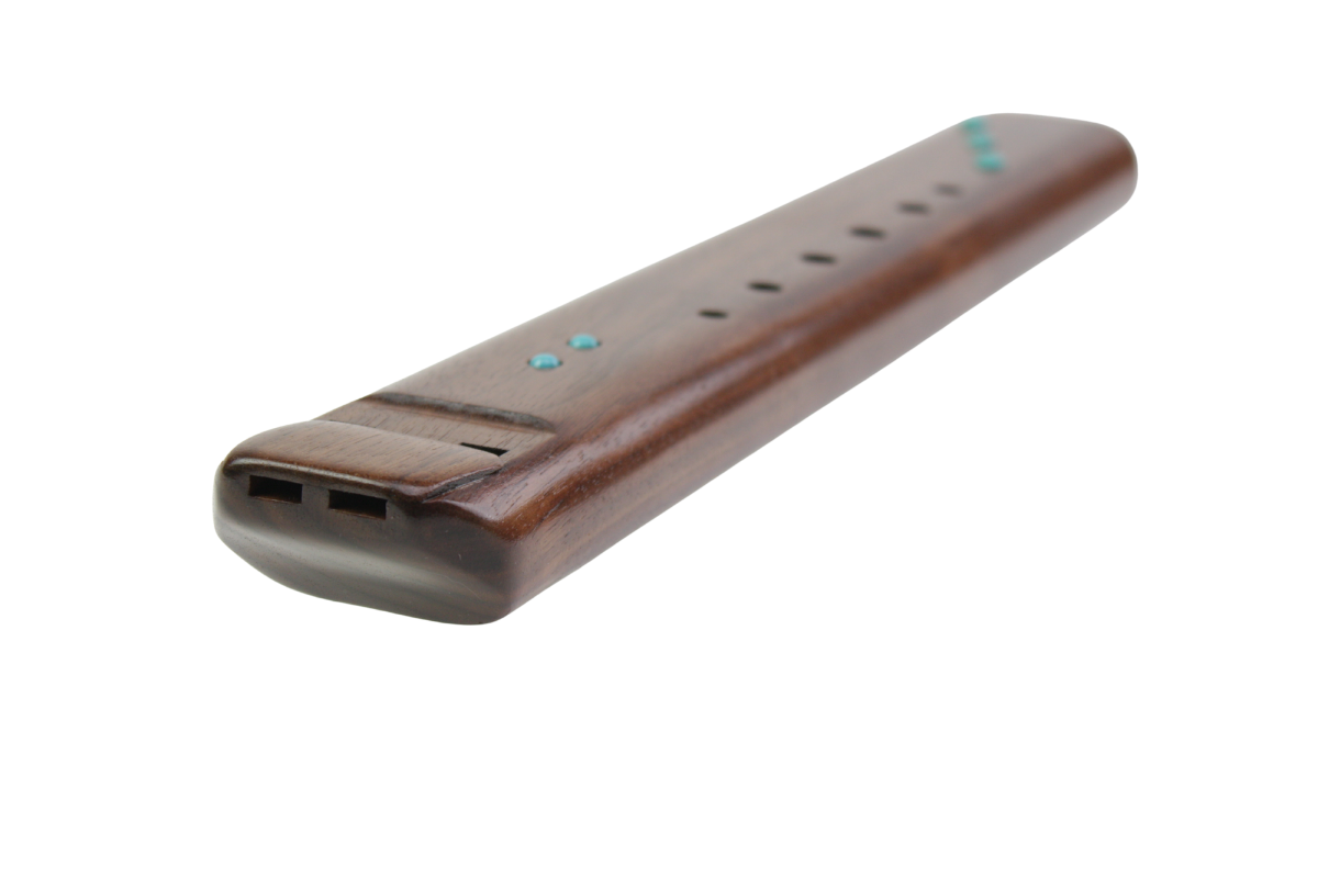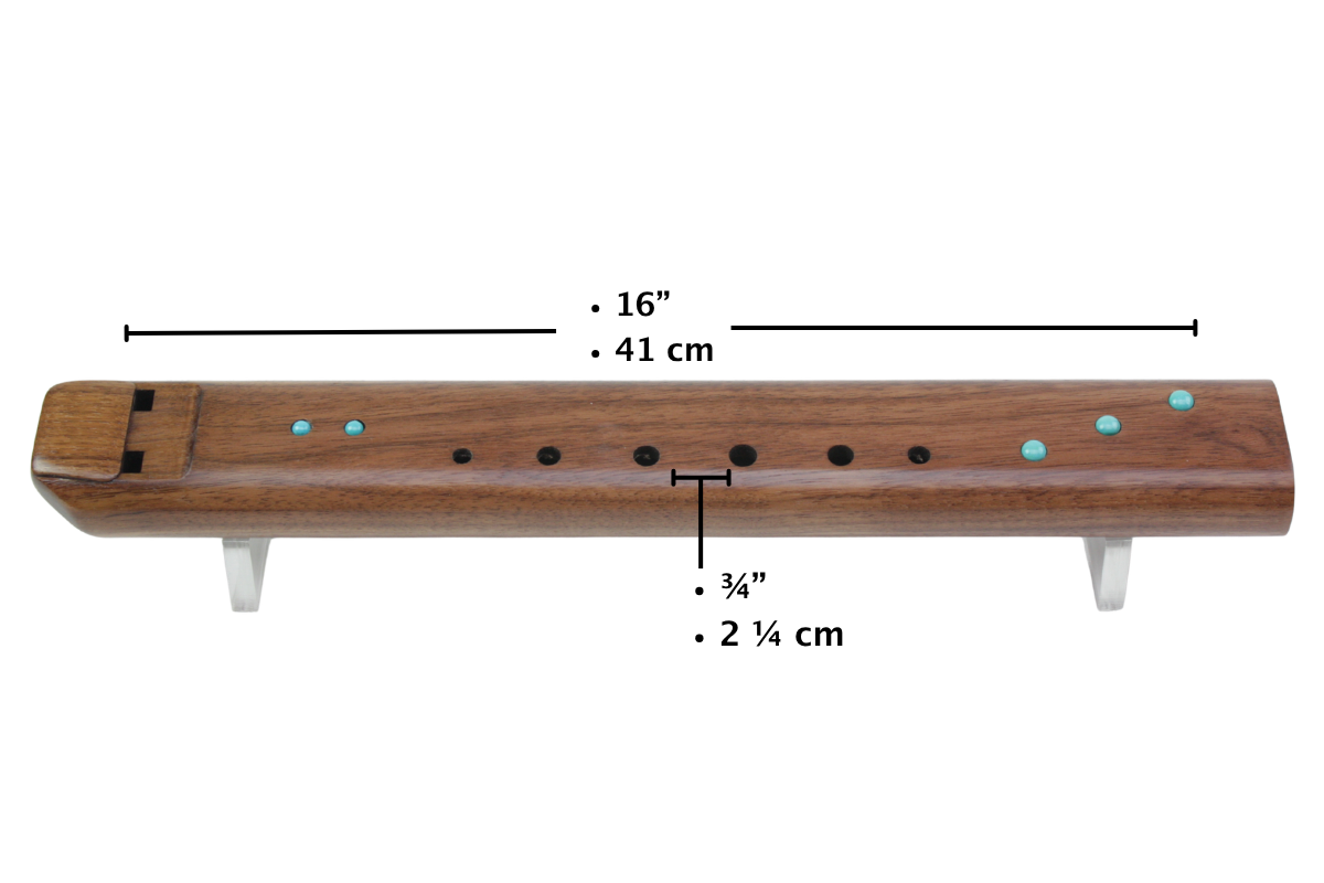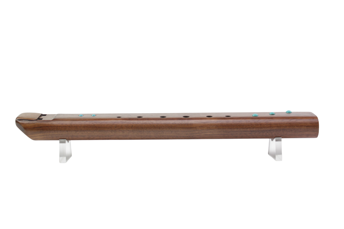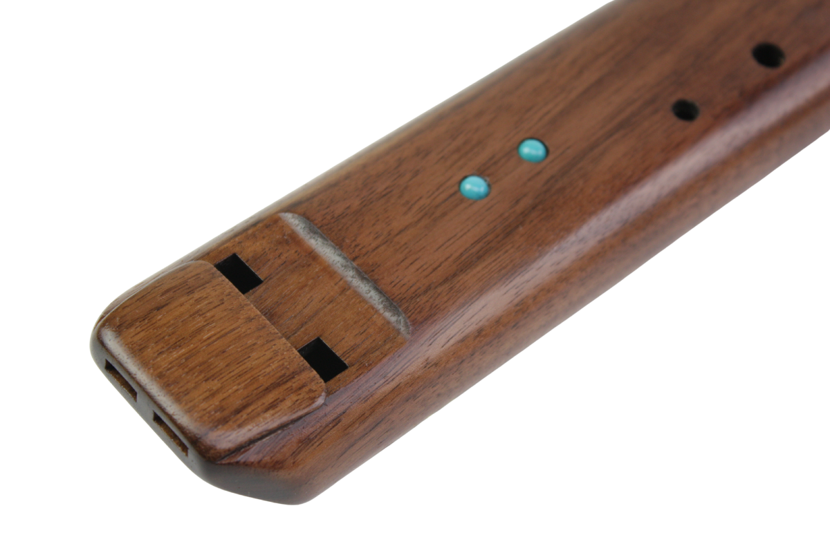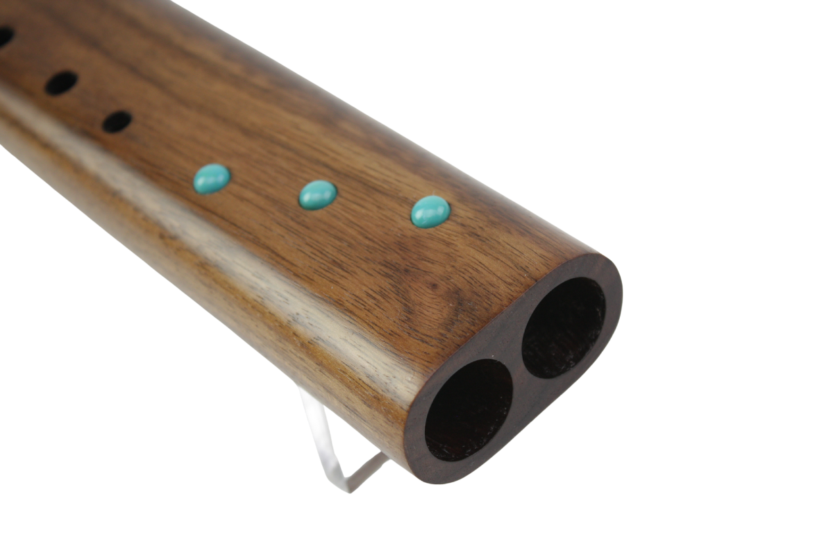 This Double Nova flute is handcrafted from a single piece of domestic Walnut wood, with Walnut wood fixed plate. Walnut is hardwood that provides a crisp, clear musical voice. We added Turquoise cabochons to enhance the decorative beauty of flute, adding to it being a piece of functional artwork.